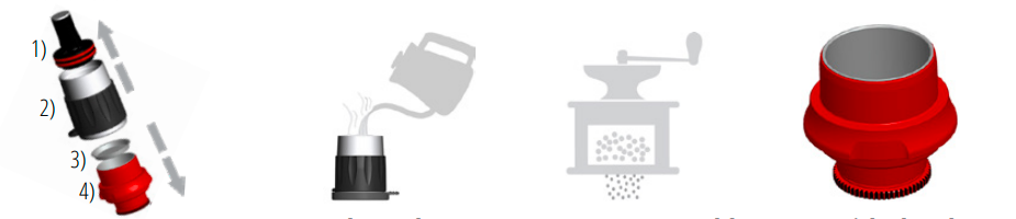 - Separate Your Brew Head - Separate the brew head into four parts: 1) Piston, 2) Brew Cylinder, 3) Screen, 4) Portafilter. Tip: Use dosing cup to remove piston.