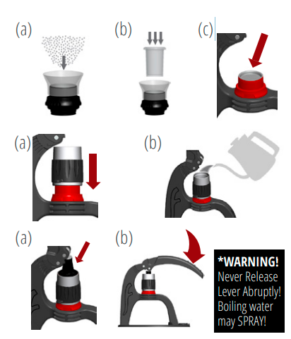 (a) Affix funnel to selected portafilter and fill with (a) Empty preheat water, remove preheat cap and (a) Add piston to top of cylinder. (b) Slowly press the *WARNING! - Never Release Lever Abruptly! Boiling water may SPRAY! |