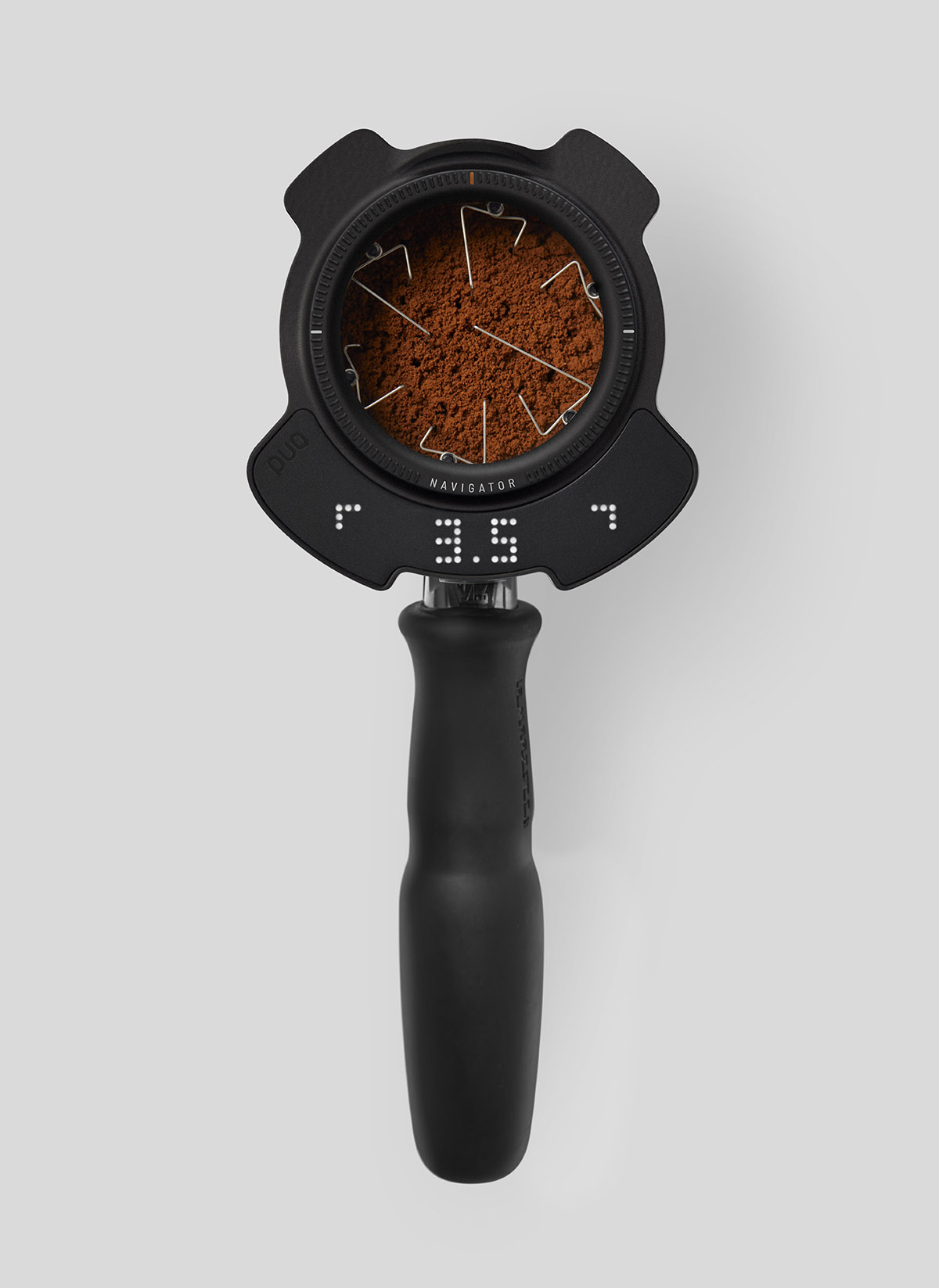 Operation is extremely simple. The device is battery-powered, so no manual stirring is required. Simply insert the portafilter with ground coffee into the device and the Navigator automatically performs the distribution. This process saves time, reduces variability in preparation, and ensures the same result with every dose.